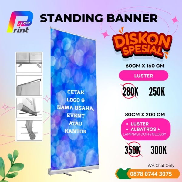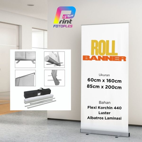 Roll Up Banner adalah bentuk banner yang pemasangannya ditarik ke atas. Cara kerjanya cukup mudah dengan menarik bagian header lalu kaitkan ke tiang penyangga di belakangnya. Keunggulan dari Roll up ini dapat dibawa kemana saja dan mudah pemasangannya. Gambar banner-nya pun bisa diubah-ubah.